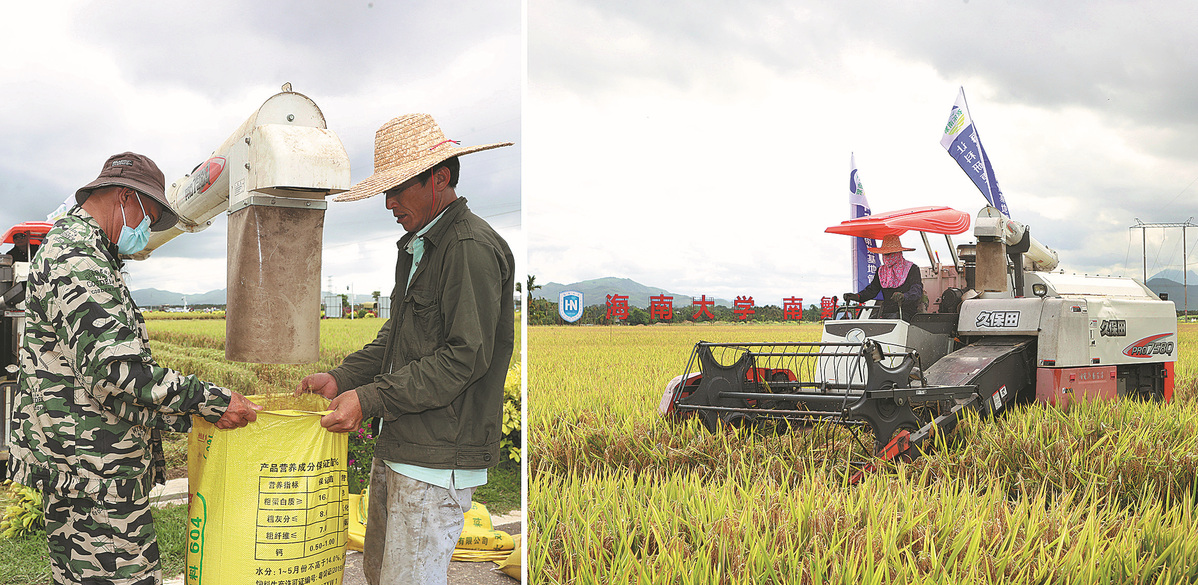 Left: Workers weigh the first-season harvest of a two-season hybrid rice at the Nanfan breeding base in Sanya, Hainan province, on Friday. Right: A harvester reaps rice in a research field. After measurement, the output stands at 13.65 metric tons per hectare, while the annual output goal of the hybrid rice is 22.5 metric tons per hectare. LI XUESHI/FOR CHINA DAILY