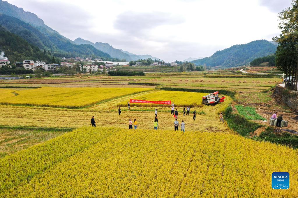 Aerial photo taken on Oct. 8, 2021 shows people gathering to check the yields of an introduced variety of rice in Leping Village of Majiang County, southwest China's Guizhou Province. Zhao Xiangrong, a former truck driver and a chef, returned to his hometown in Guizhou and started planting rice in 2015. Supported and guided by local government and experts, Zhao has developed skills in cultivating rice containing zinc, selenium and other microelement. After six years of hard work, Zhao has accumulated rich experience in sowing seeds, managing field, as well as processing, transportation and storage of rice. The rice planting area of Zhao Xiangrong reached nearly 300 mu (20 hectares) this year, and his high-quality rice has gained great reputation in many provinces of China. Zhao has vigorously shared his experience with fellow villagers and is willing to make further contribution to the development of local rice industry and rural revitalization. (Xinhua/Yang Wenbin)