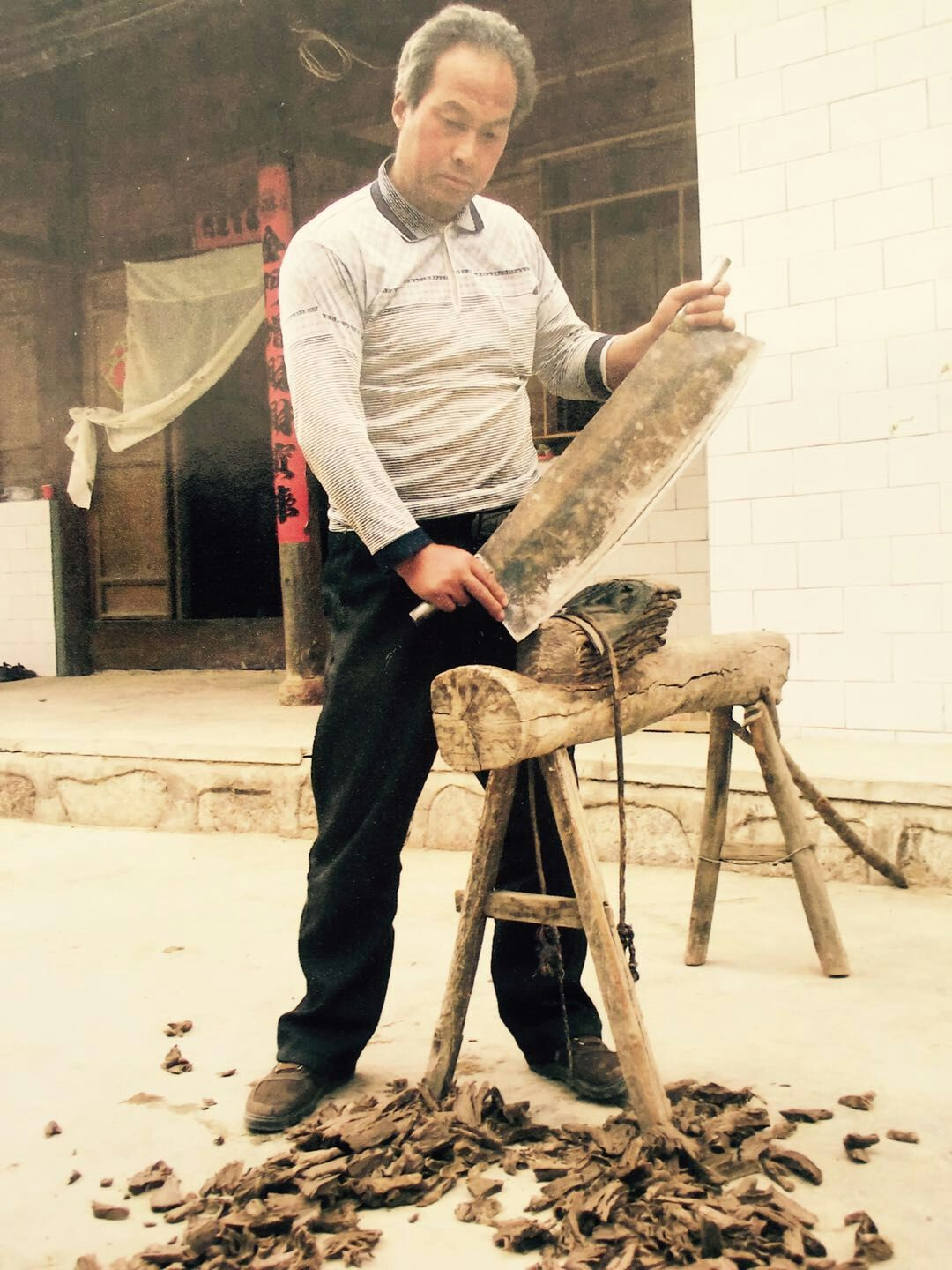 Hu Fengyu, a resident of Liuhe Village, Xigaoshan Township, Xihe County, Longnan City, Gansu Province, demonstrates the first part of the process of making paper by hand with mulberry bark. He mentioned that he is part of the fifth generation of people in his family who are involved with the craft.