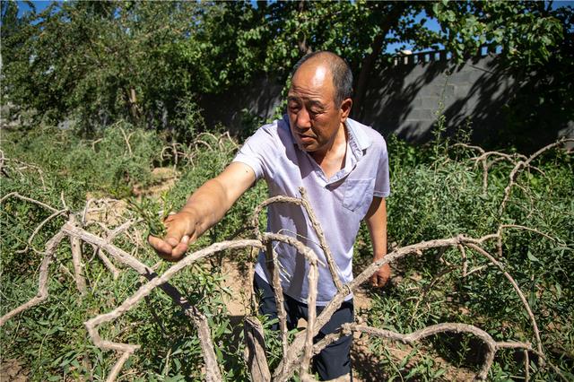 Li Shizhong, a farmer from the Ningxia Hui autonomous region, takes care of his goji berry trees. [Photo/Xinhua]