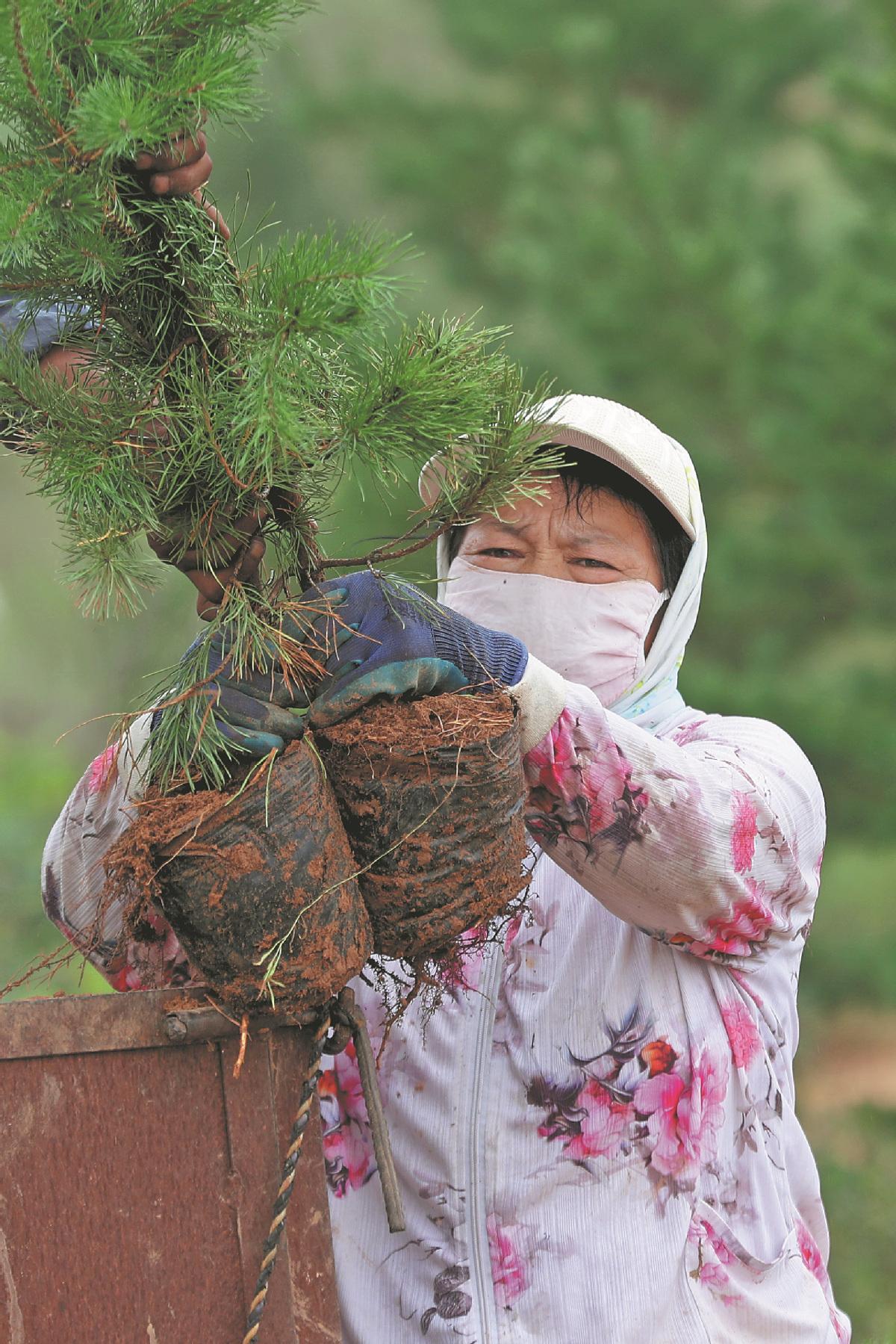 A resident plants Scots pine saplings in the Mu Us Desert in Shenmu city, Shanxi province. JIANG QIMING/CHINA NEWS SERVICE