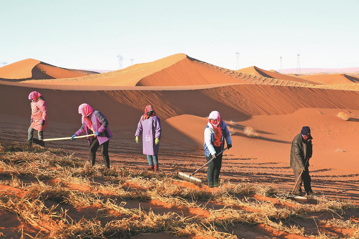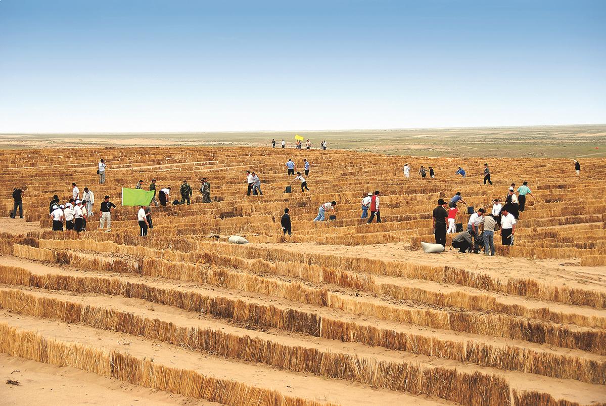 Sandcontrol workers help prepare barriers that will house sand-resistant plants in Gansu province. YANG YONGWEI/FOR CHINA DAILY
