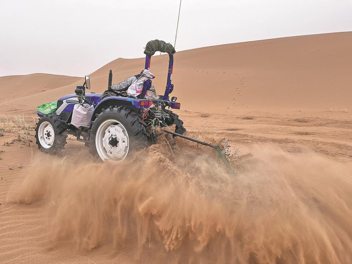 A farmer plows land ready for sweetvetch shrubs to be planted in the Tengger Desert, Inner Mongolia autonomous region. SURINA/FOR CHINA DAILY