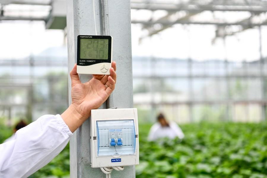 A worker checks the temperature and humidity at a seedling greenhouse in Kaiyang County of Guiyang, southwest China's Guizhou Province, May 23, 2023. (Xinhua/Yang Wenbin)