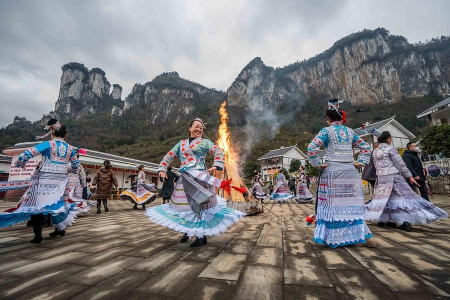 Tourists dance with people of Miao ethnic group in Huawu Village of Xinren Miao Township, Qianxi City, southwest China's Guizhou Province, Jan. 2, 2023. (Photo by Luo Dafu/Xinhua)