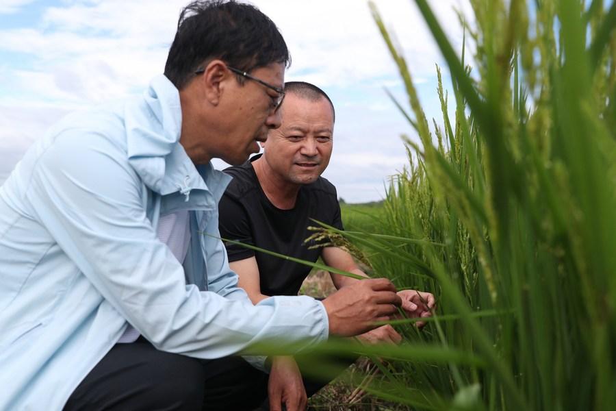 Agricultural technicians check conditions of rice at a rice field affected by floods in Shangzhi City, northeast China's Heilongjiang Province, Aug. 11, 2023. (Xinhua/Zhang Tao)