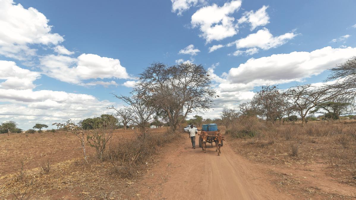 Cattle are used to pull a cart carrying water at Kasioni village, Makindu, in September. (CHINA DAILY/XIE SONGXIN)