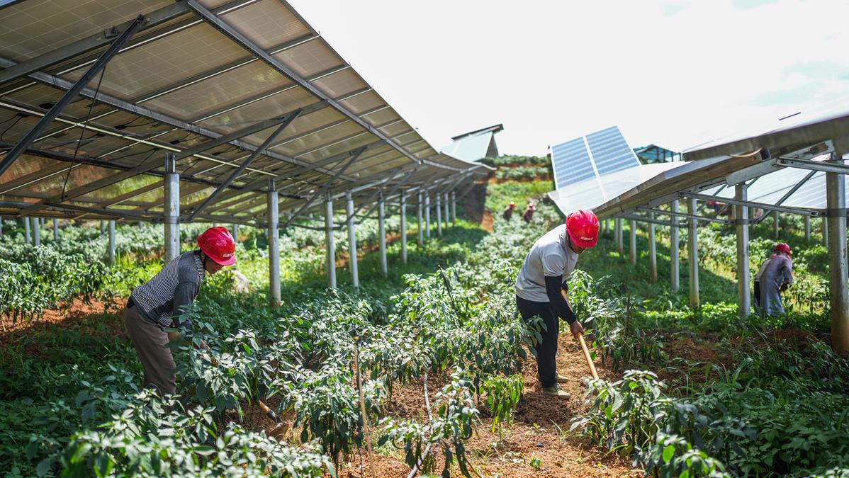 Similarly, at an agrivoltaic demonstration area in Xinqiao township, Qianxinan Bouyei and Miao autonomous prefecture in Guizhou province, neatly arranged solar panels cast shadows on rows of red chili plants, and workers are busy harvesting and loading red chilies onto trucks.
