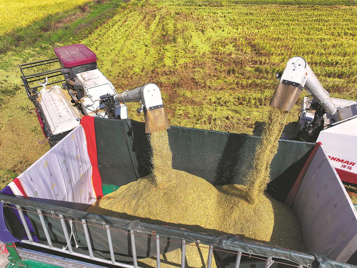 Harvesters load a truck with newly-harvested rice in Liuyang, Hunan province, on Nov 1. [Photo/Xinhua]