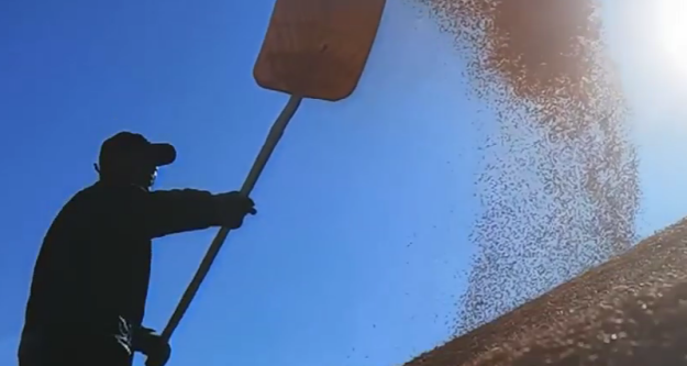 A worker uses a tool to lift the corn kernels, allowing the wind to remove impurities.