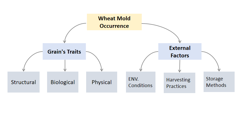 During the harvest season, the occurrence of wheat mold is closely associated with the grain’s structural, biological, and physical traits, as well as environmental conditions, harvesting practices, and storage methods.