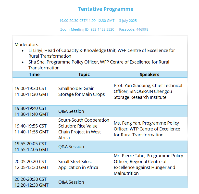 Relevant thematic video courses from the WFP-China South-South Cooperation Knowledge Sharing Platform and Cloud School (m.ziyol.com) will be shared with registered participants as reference in advance. A post-survey will be administered to collect participant feedback and identify priority areas for future capacity building initiatives.